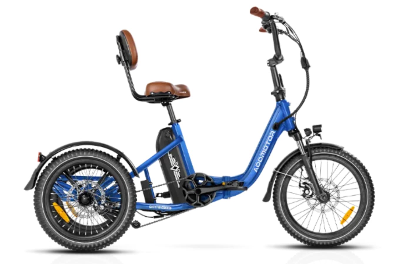 Tersedia dua varian model berdasarkan ukuran rodanya. Model yang lebih besar dilengkapi dengan ban depan 20 inci dan ban belakang 18 inci. Model yang lebih kecil memiliki ban depan 18 inci dan ban belakang 16 inci. E-trike memiliki rem tiga cakram serta satu set spatbor, rem parkir, suspensi depan, klakson, dan bel.