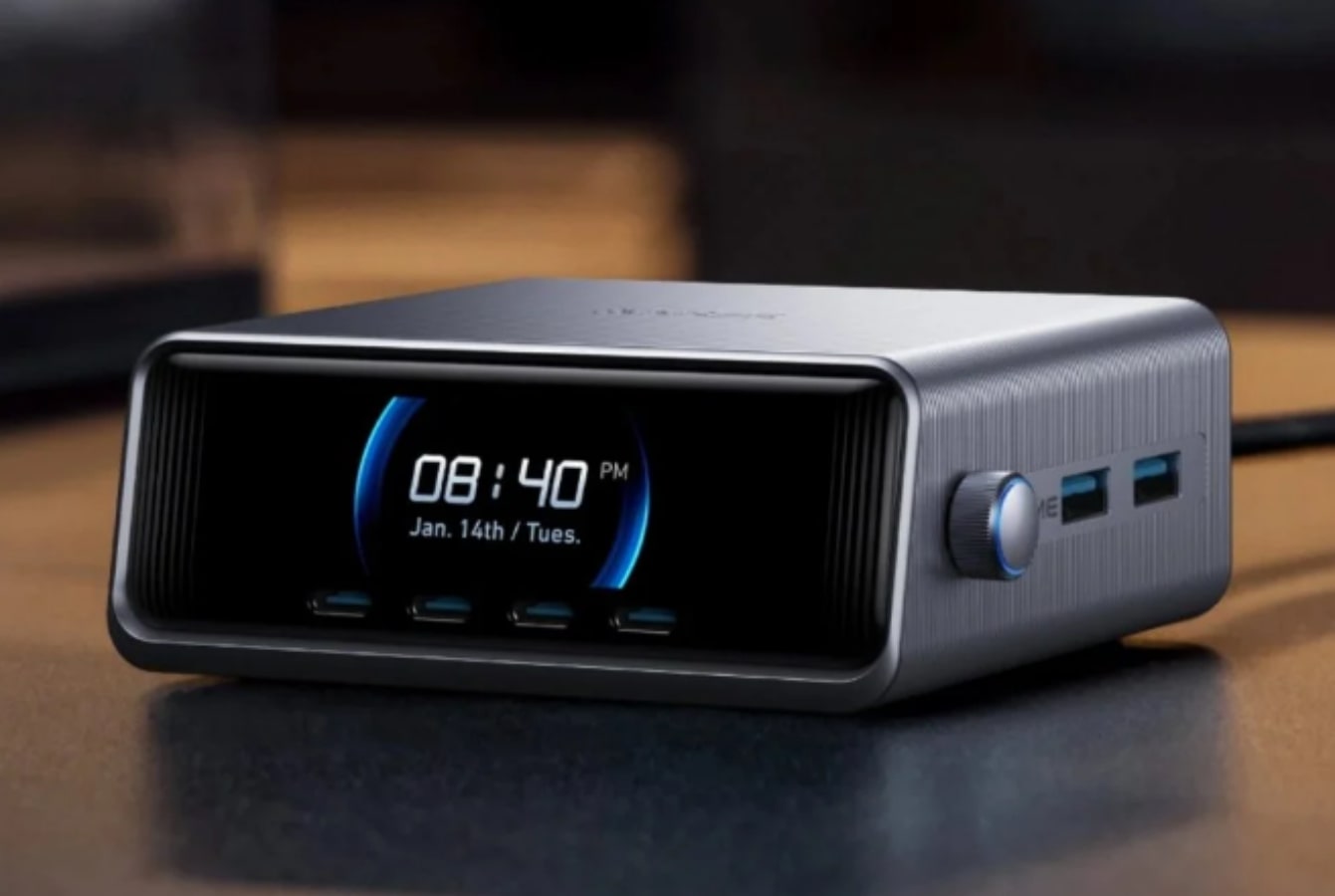 Pengisi daya Anker Prime GaN baru memiliki LCD 2,26 inci yang menunjukkan status dan kecepatan pengisian daya. LCD juga dapat menampilkan waktu dan tanggal. Terdapat tombol kontrol di sisi pengisi daya yang memungkinkan pengguna menyesuaikan kecepatan pengisian daya di antara empat mode.