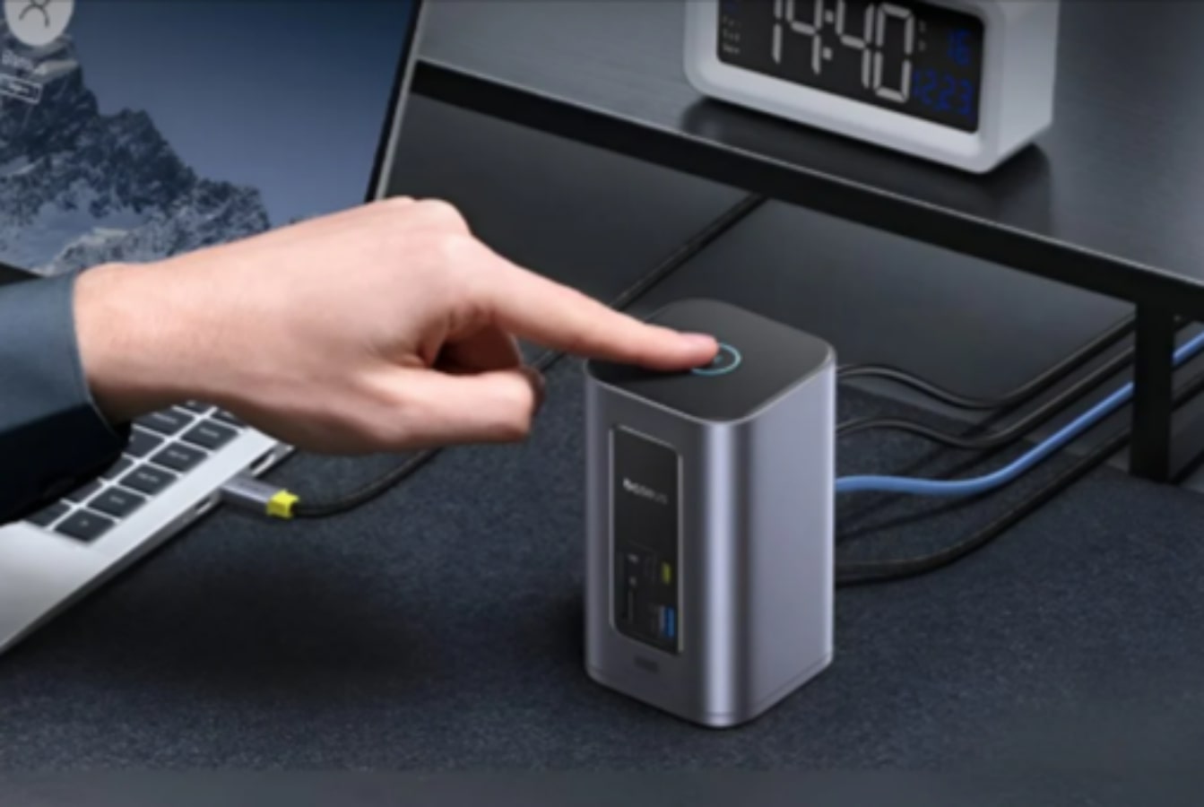 Baseus Nomos NU1 Air memiliki tinggi 115,5 mm dan menampilkan desain vertikal minimalis yang dirancang untuk menghemat ruang meja sekaligus menjaga port tetap mudah dijangkau. (nano)