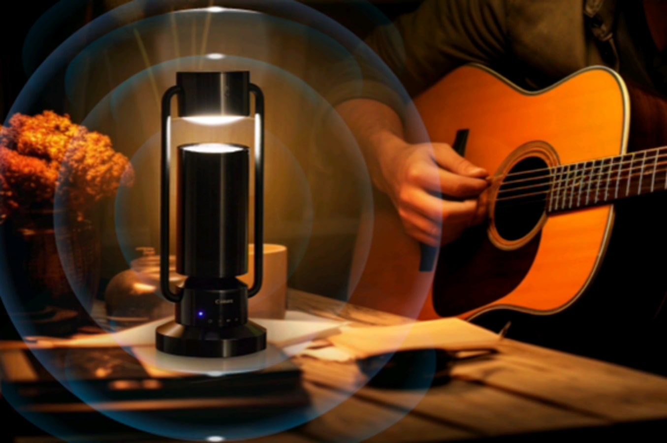 Speaker ringan Canon yang baru dapat dipasangkan ke perangkat input melalui Bluetooth. Ini memiliki daya tahan baterai sekitar 5 jam dan dapat diisi ulang melalui USB-C. Lampu, lengan, dan badan speaker lampu dapat digerakkan secara mandiri dan sudut pencahayaan dapat disesuaikan dengan mudah dengan satu tangan. Ia menggunakan struktur berhenti bebas dan dapat dihentikan dengan mudah dalam jangkauan bergerak.