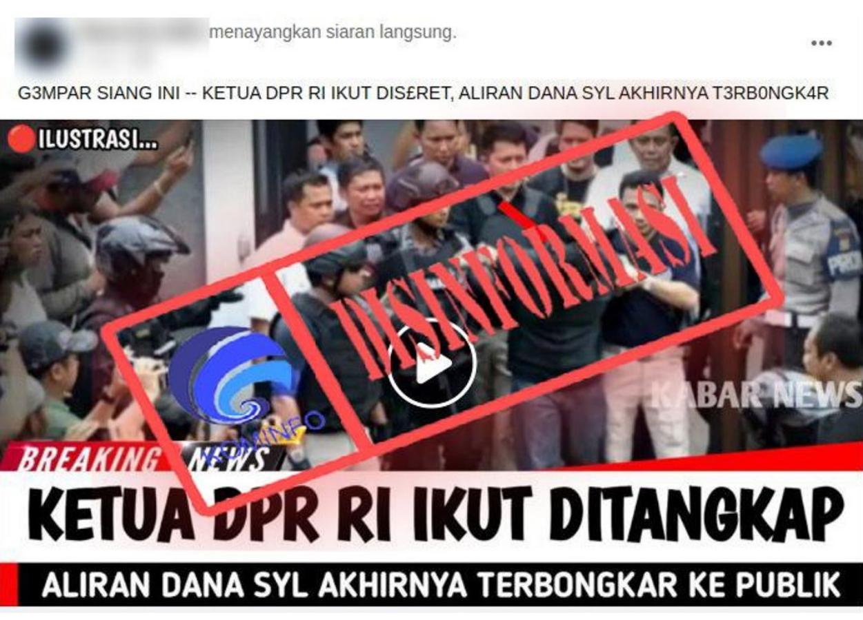 Beredar unggahan di media sosial Facebook sebuah video dengan gambar thumbnail seorang pria ditangkap oleh segerombolan polisi disertai narasi yang mengeklaim bahwa Ketua Dewan Perwakilan Rakyat (DPR) ditangkap terkait dugaan aliran dana korupsi mantan Menteri Pertanian Syahrul Yasin Limpo (SYL).