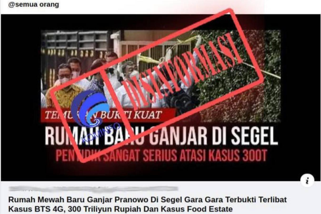 Sukoharjonews.com – Calon presiden (capres) Ganjar Pranowo tak luput dari konten hoaks. Dalam unggahan video yang beredar di Facebook mengeklaim jika rumah mantan Gubernur Jateng tersebut disegel karena diguga terlibat dalam kasus korupsi BTS 4G, pencucian uang Rp300 triliun.