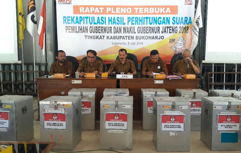 Sukoharjonews.com (Sukoharjo) – Bermasalahnya rekapitulasi di dua kecamatan membuat Rapat Pleno Rekapitulasi Pilgub Jateng oleh KPU Sukoharjo molor, Kamis (5/7). Meski akhirnya dua kecamatan yang bermasalah, Grogol dan Kartasura klir, pleno tersebut baru selesai sore hari. Berdasarkan hasil pleno, perolehan suara paslon tidak jauh beda dengan hitung cepat C1 yang dilakukan KPU sebelumnya.