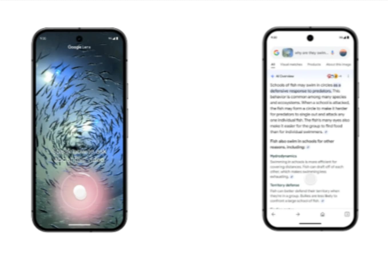 Saat Lens mulai merekam, pengguna dapat mengajukan pertanyaan berdasarkan apa yang mereka lihat. Menanggapi pertanyaan “Mengapa mereka berenang bersama?” Lens merespons menggunakan Google Gemini.