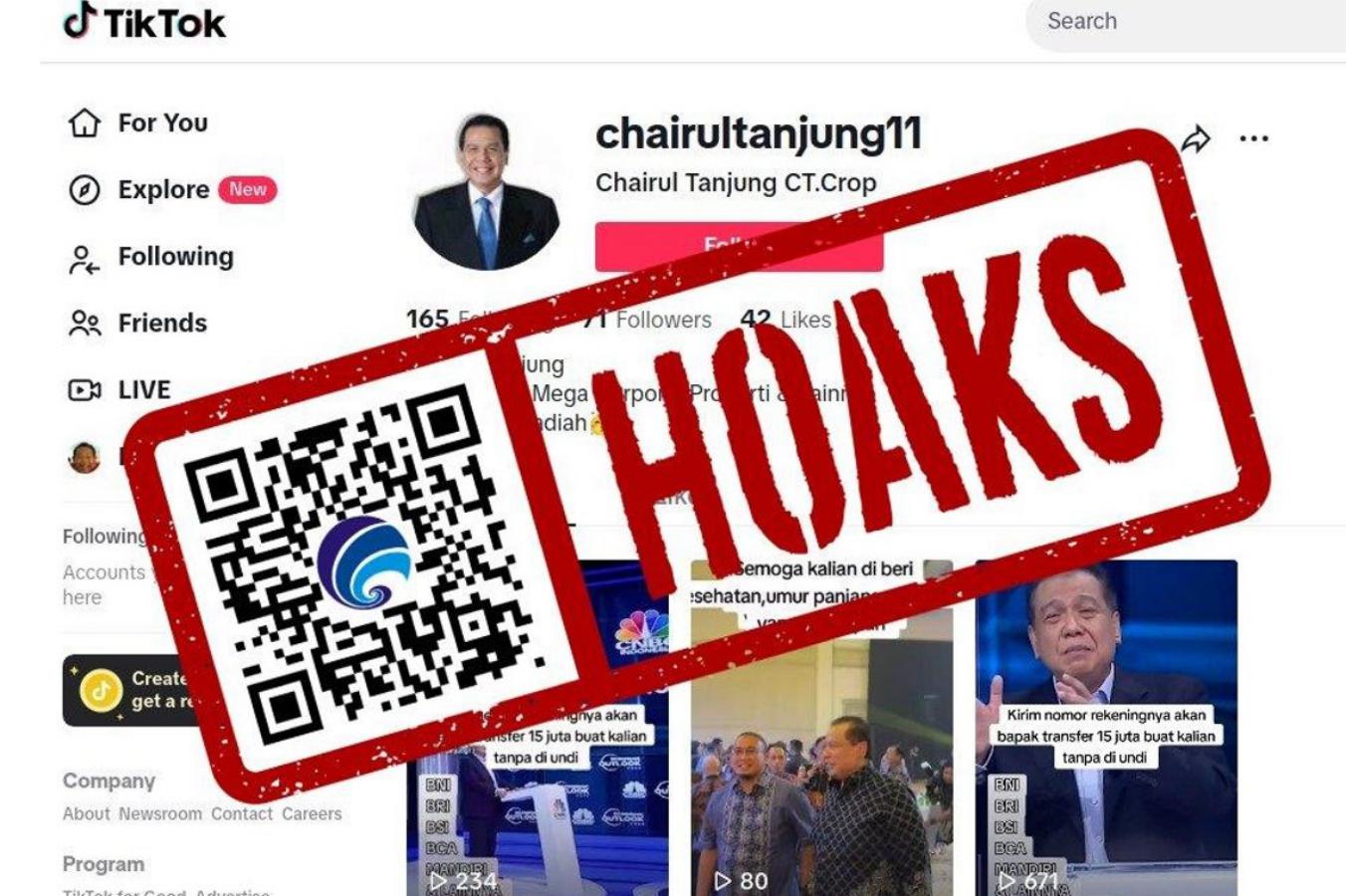 Sukoharjonews.com – Akun hoaks kembali muncul. Kali ini akun Tiktok mengatasnamakan Chairul Tanjung dengan menyertakan bio “Choirul Tanjung CT.Corp, PT Mega Corpora, Properti dan Lainnya” dan mengatakan berbagi hadiah.