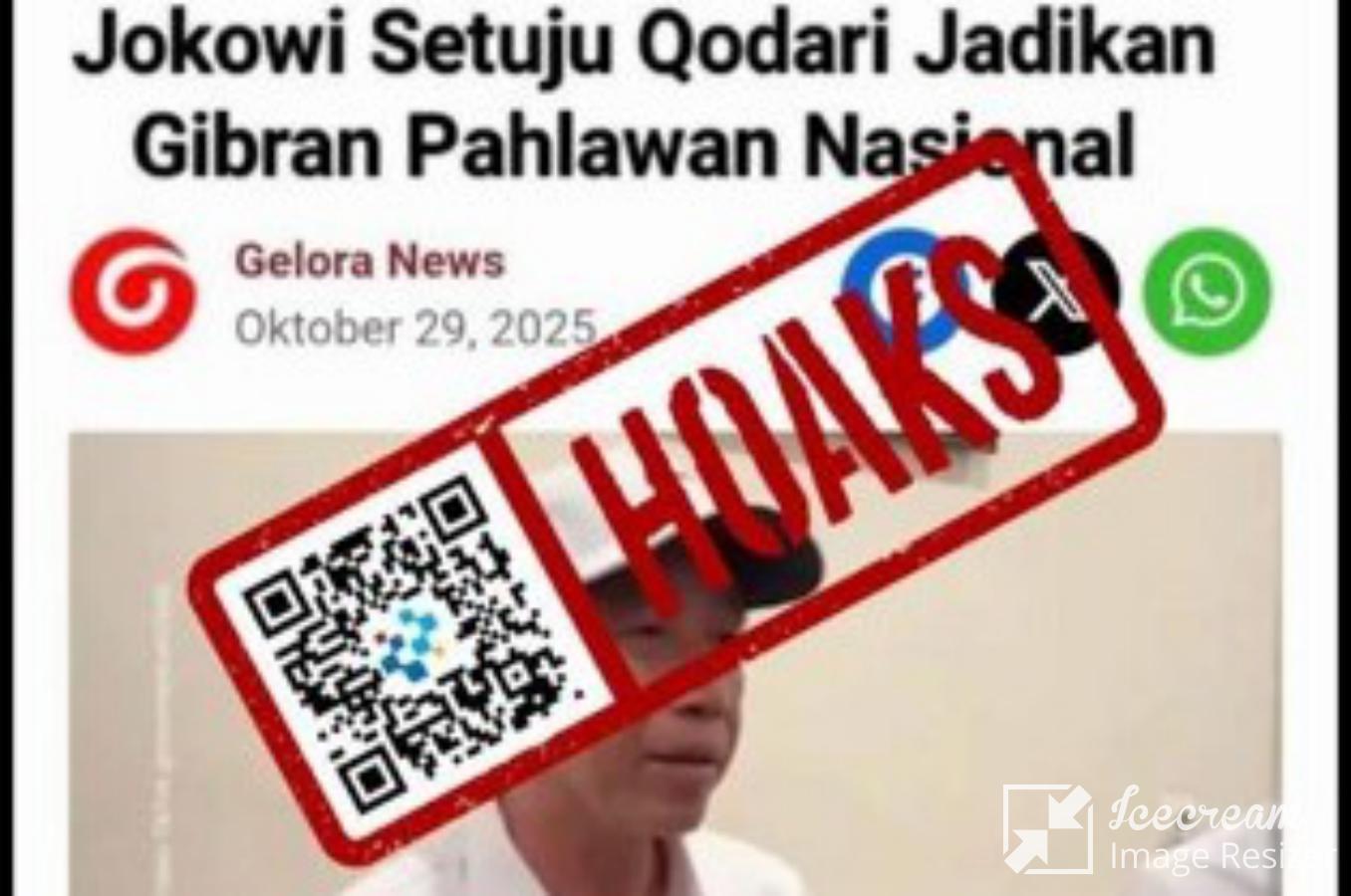 Beredar sebuah unggahan di media sosial Facebook judul artikel Gelora News yang mengeklaim Presiden Ke-7 Republik Indonesia Joko Widodo (Jokowi) setujui usulan M. Qodari agar Wakil Presiden Gibran Rakabuming Raka jadi pahlawan nasional.