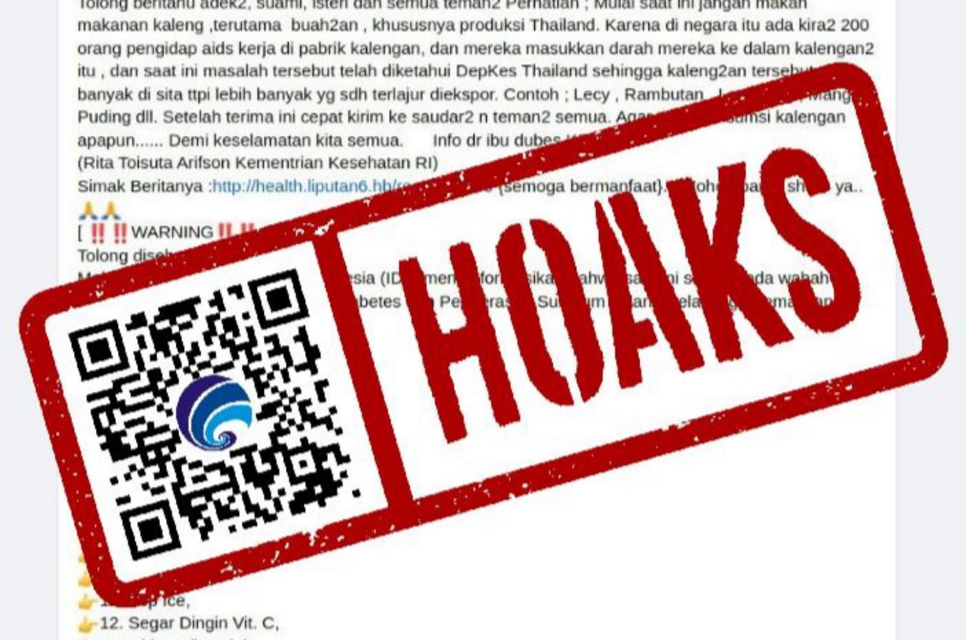 Beredar sebuah unggahan di media sosial Facebook yang memberikan informasi mengenai imbauan kepada masyarakat agar tidak memakan makanan impor dari Thailand termasuk buah-buahan. Dalam unggahan tersebut, dijelaskan karena pekerja di pabrik kalengan tersebut memasukan darah ke makanan yang akan diimpor dan akan menimbulkan penyakit Acquired Immune Deficiency Syndrome (AIDS).
