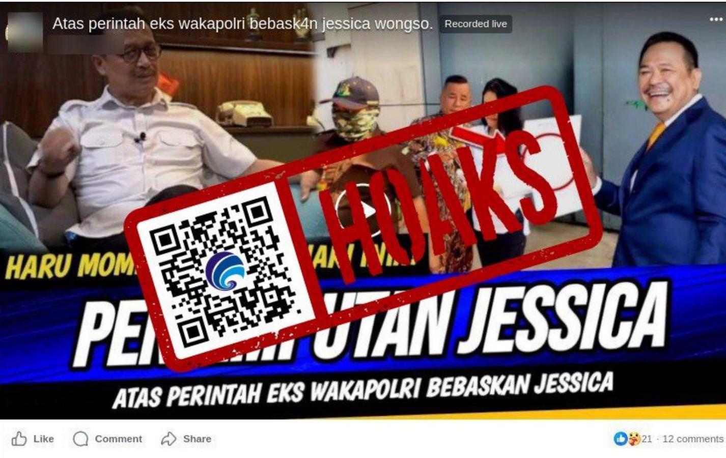 Beredar sebuah unggahan di media sosial Facebook yang mengeklaim bahwa terpidana kasus pembunuhan Wayan Mirna Salihin, Jessica Kumala Wongso dibebaskan atas perintah dari mantan Wakil Kepala Kepolisian Republik Indonesia (Wakapolri).