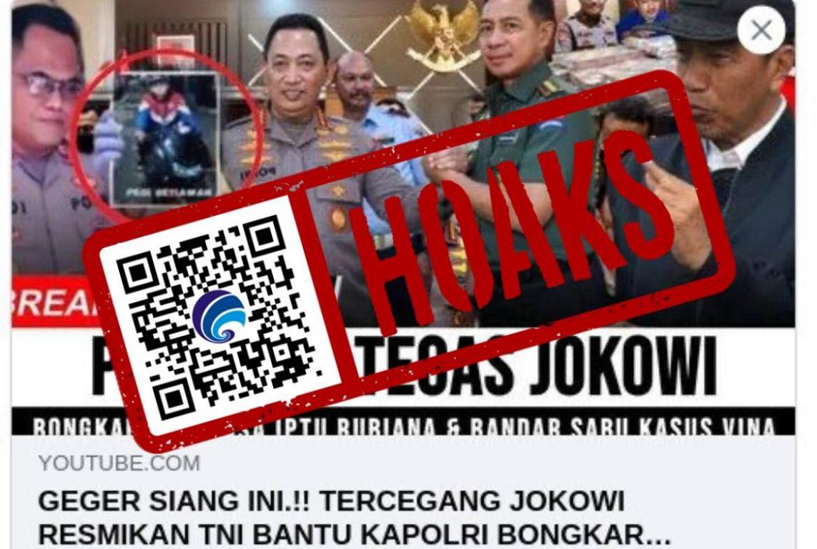Sukoharjonews.com – Hoaks kali ini berupa video yang diunggah di platform Youtube. Dalam video menyampaikan narasi yang mengeklaim jika Presiden Jokowi resmikan TNI membantu Polri membongkar kasus Vina Cirebon dan bandar sabu.