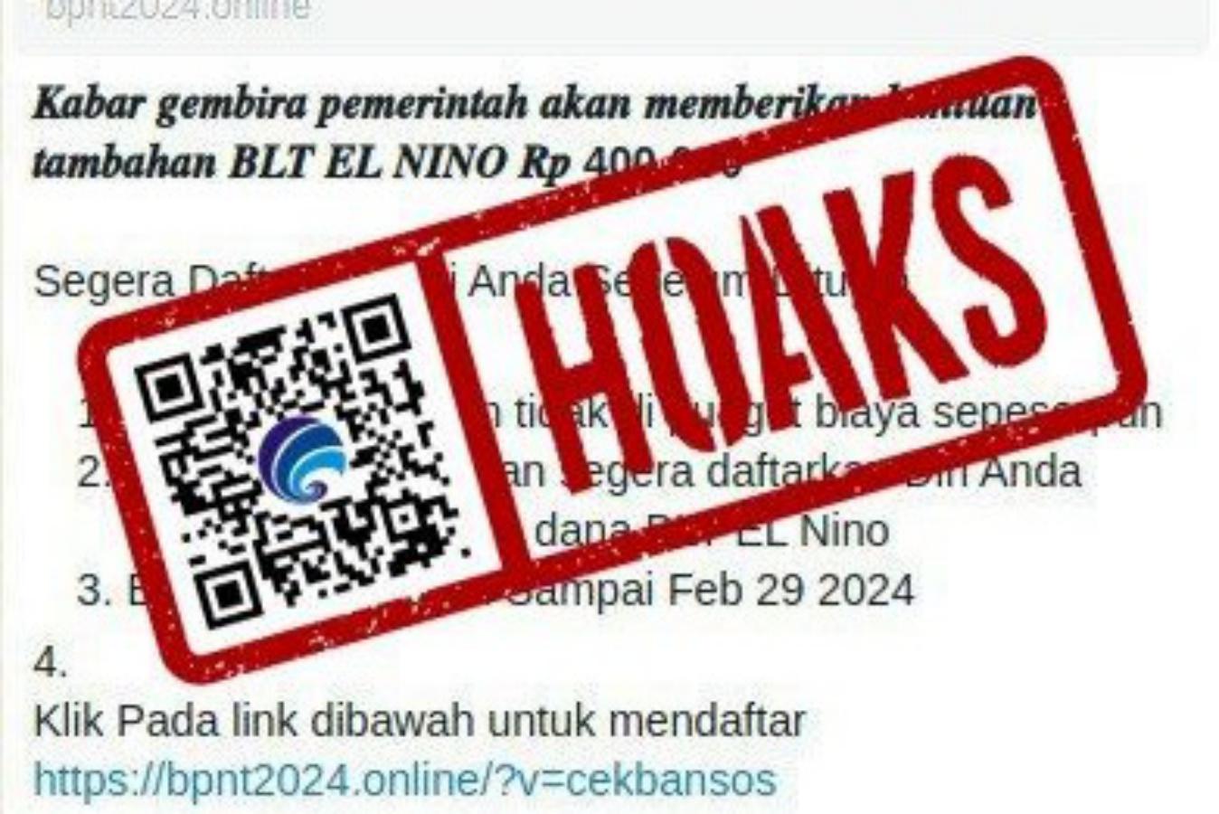 Sukoharjonews.com – Hoaks kali ini tidak terkait politik, tapi soal Bantuan Langsung Tunai(BLT) El Nino. Hoaks berupa pesan berantai melalui Whatsapp tentang informasi BLT El Nino sebesar Rp400 ribu. Bahkan, dalam pesan tersebut juga menyertakan tautan link pendaftaran.