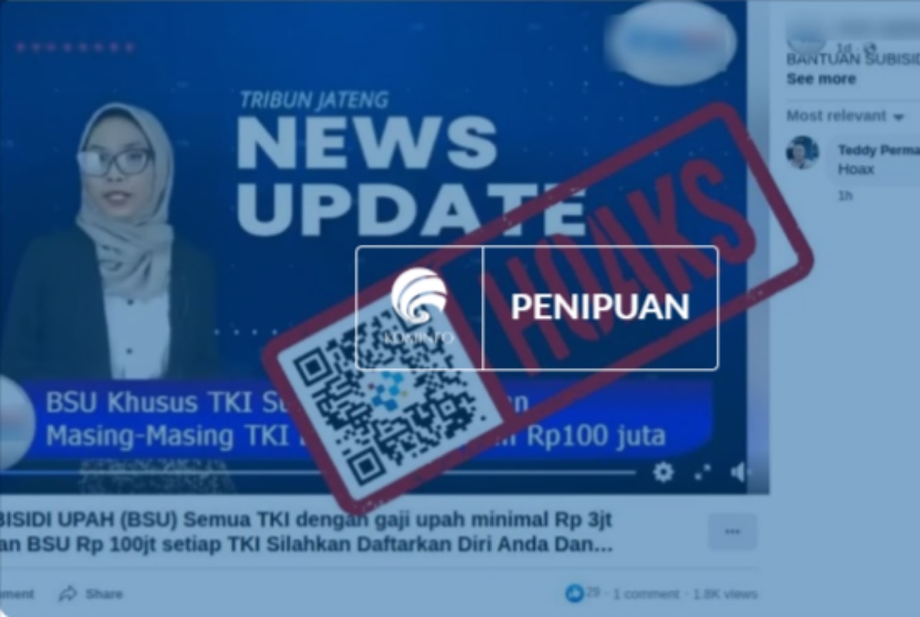 Beredar sebuah unggahan video di media sosial Facebook yang mengeklaim adanya Bantuan Subsidi Upah (BSU) dari pemerintah sebesar Rp100 juta kepada para Tenaga Kerja Indonesia (TKI).