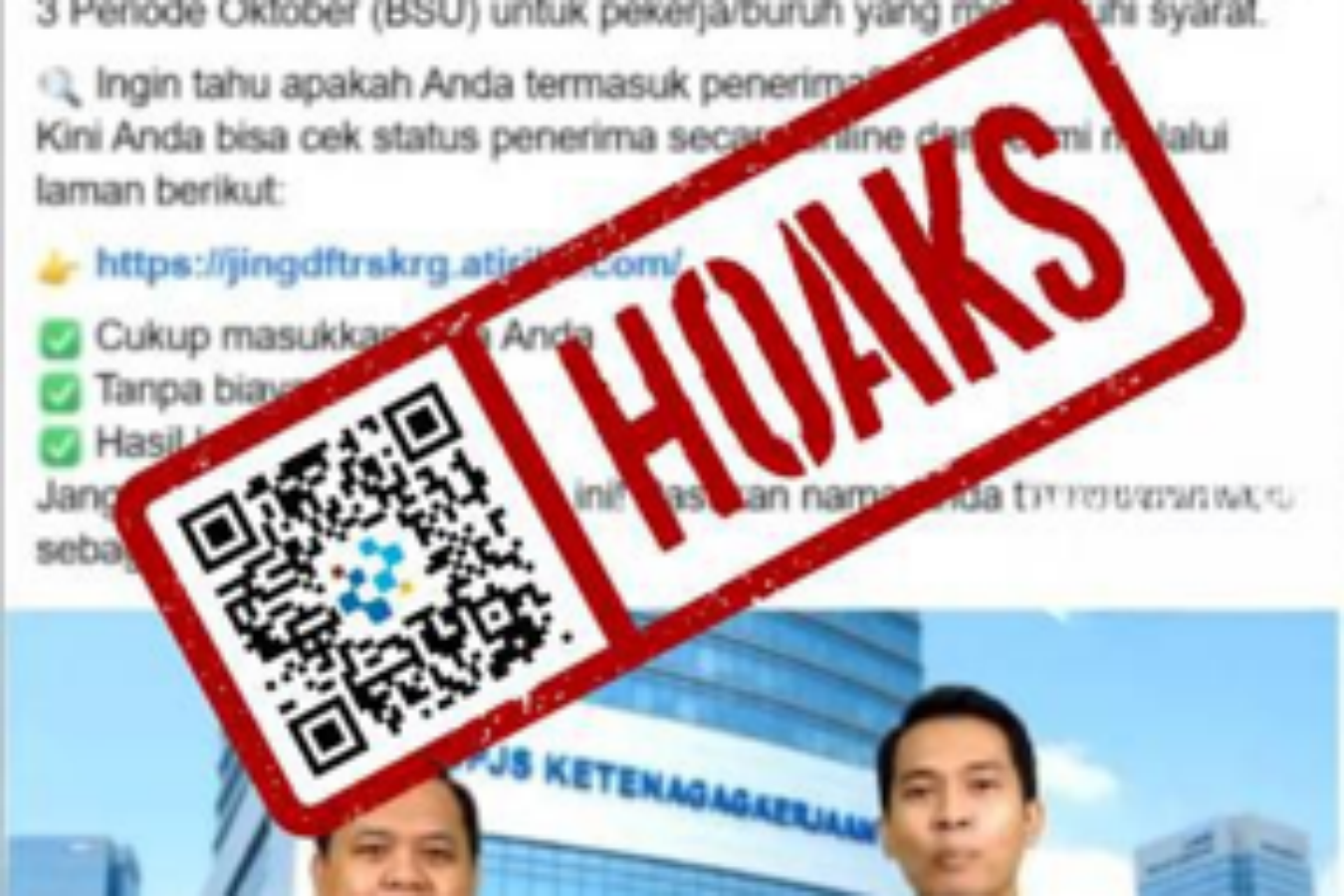 Sukoharjonews.com – Sebuah unggahan berupa hoaks beredar di media sosial Facebook. Unggahan ini mengeklaim sebuah tautan untuk mengecek penerima Bantuan Subsidi Upah (BSU) periode Oktober 2025.