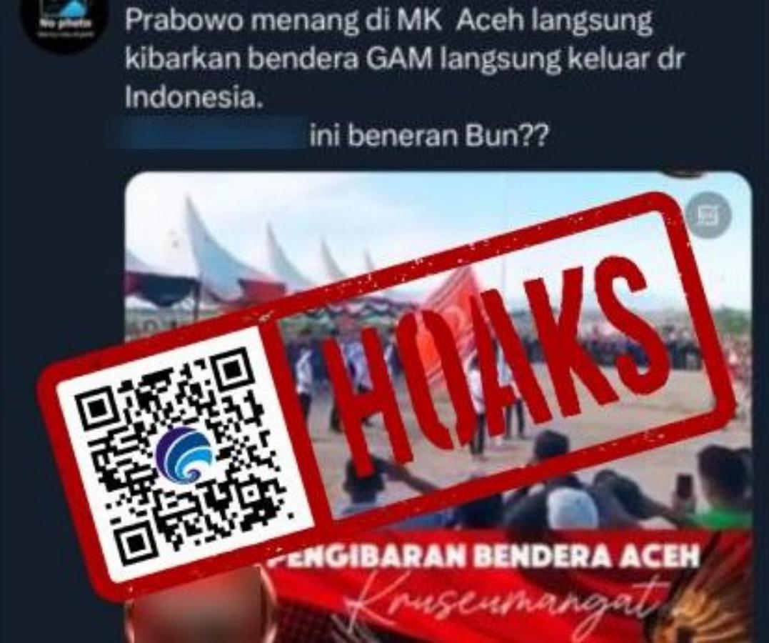 Beredar sebuah unggahan video di media sosial X dengan narasi yang menyebut bahwa setelah Prabowo Subianto-Gibran Rakabuming Raka dinyatakan menang sebagai presiden dan wakil presiden terpilih, Provinsi Aceh langsung mengibarkan bendera bulan bintang Gerakan Aceh Merdeka (GAM) dan menyatakan Provinsi Aceh keluar dari Negara Indonesia.