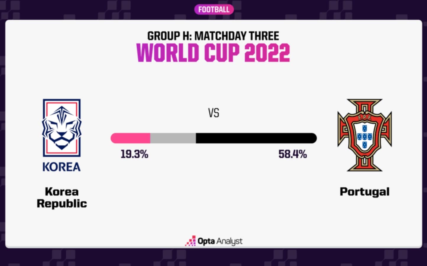 Portugal sangat membutuhkan hasil dalam hal memenangkan grup, dan model prediksi Opta tidak menjadikan mereka sebagai favorit yang luar biasa, meskipun pasukan Santos masih diharapkan untuk menang dengan peluang menang 58,4%.