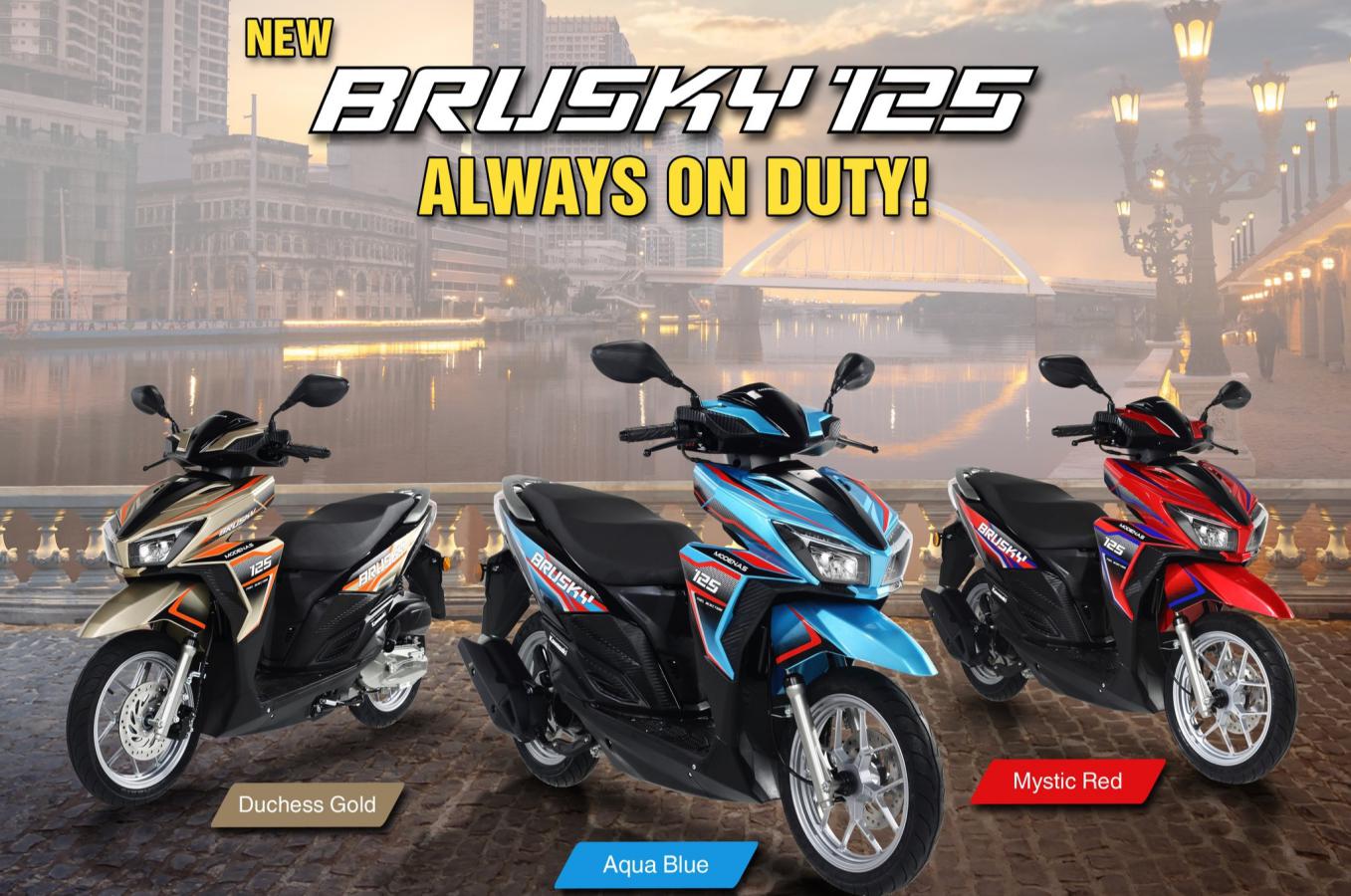 Brusky 125 hadir dengan tampilan sport sepenuhnya. Kendaraan ini menonjol dengan lampu depan LED ganda dan topeng ramping, yang menambah kesan agresif pada bagian depan kendaraan. Joknya merupakan jok tunggal yang ditinggikan, sehingga memberikan posisi berkendara yang nyaman dan kontrol yang mudah.