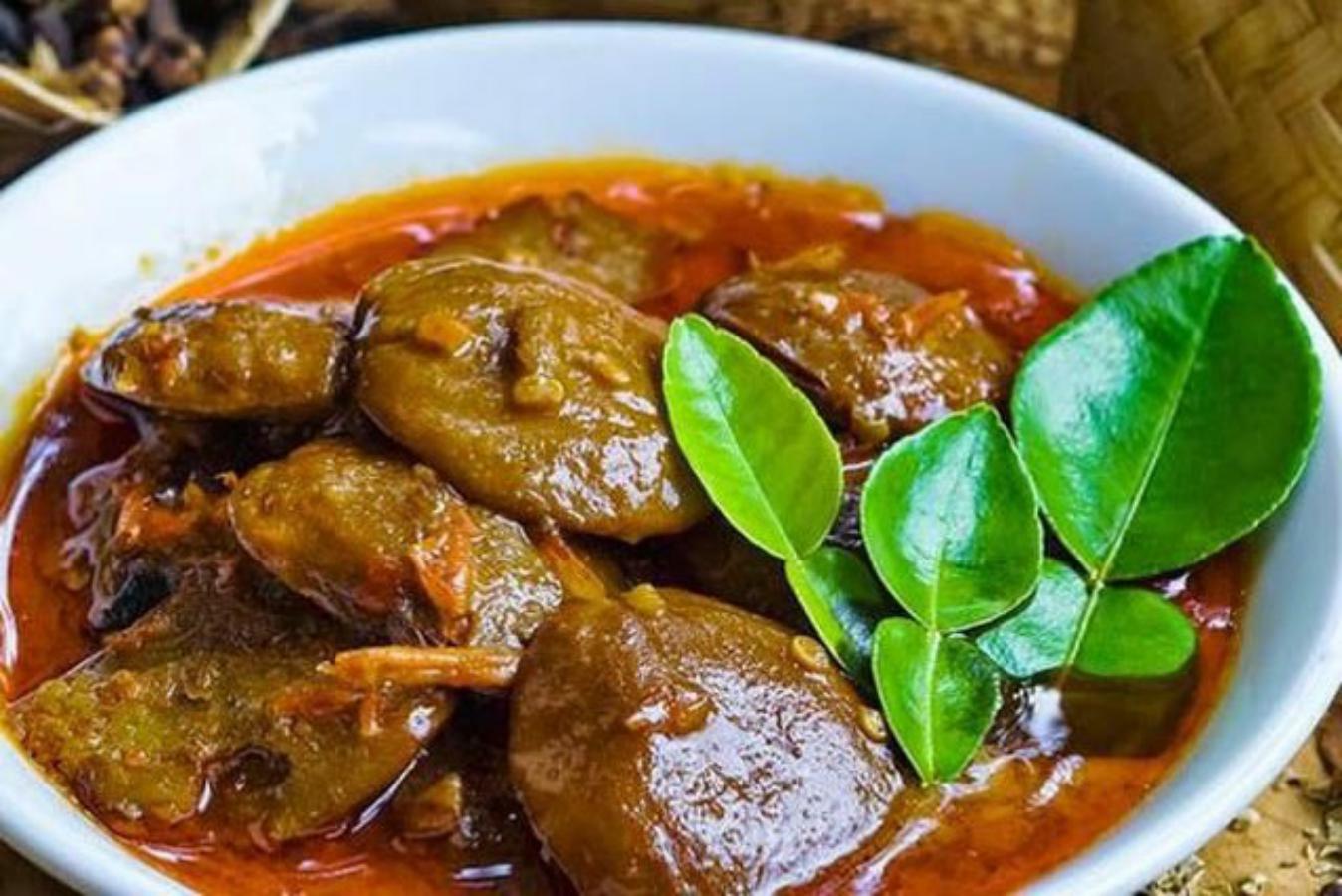• Angkat dan rendang jengkol yang enak, empuk dan belum siap disajikan dengan taburan bawang goreng di atasnya.