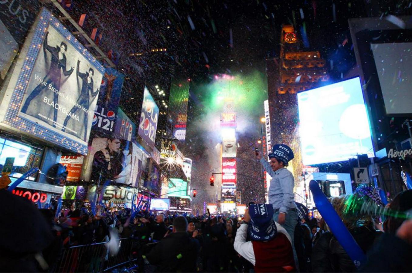 Keributan Tahun Baru perdana di Times Square dimulai pada tahun 1904 untuk merayakan pembukaan kantor pusat The New York Times; saat ini ratusan ribu orang turun ke pusat kota yang ramai setiap tanggal 31 Desember untuk mengadakan pesta yang berbeda dari biasanya di New York City. Di lokasi ini penjual makanan dan minuman tidak diizinkan.