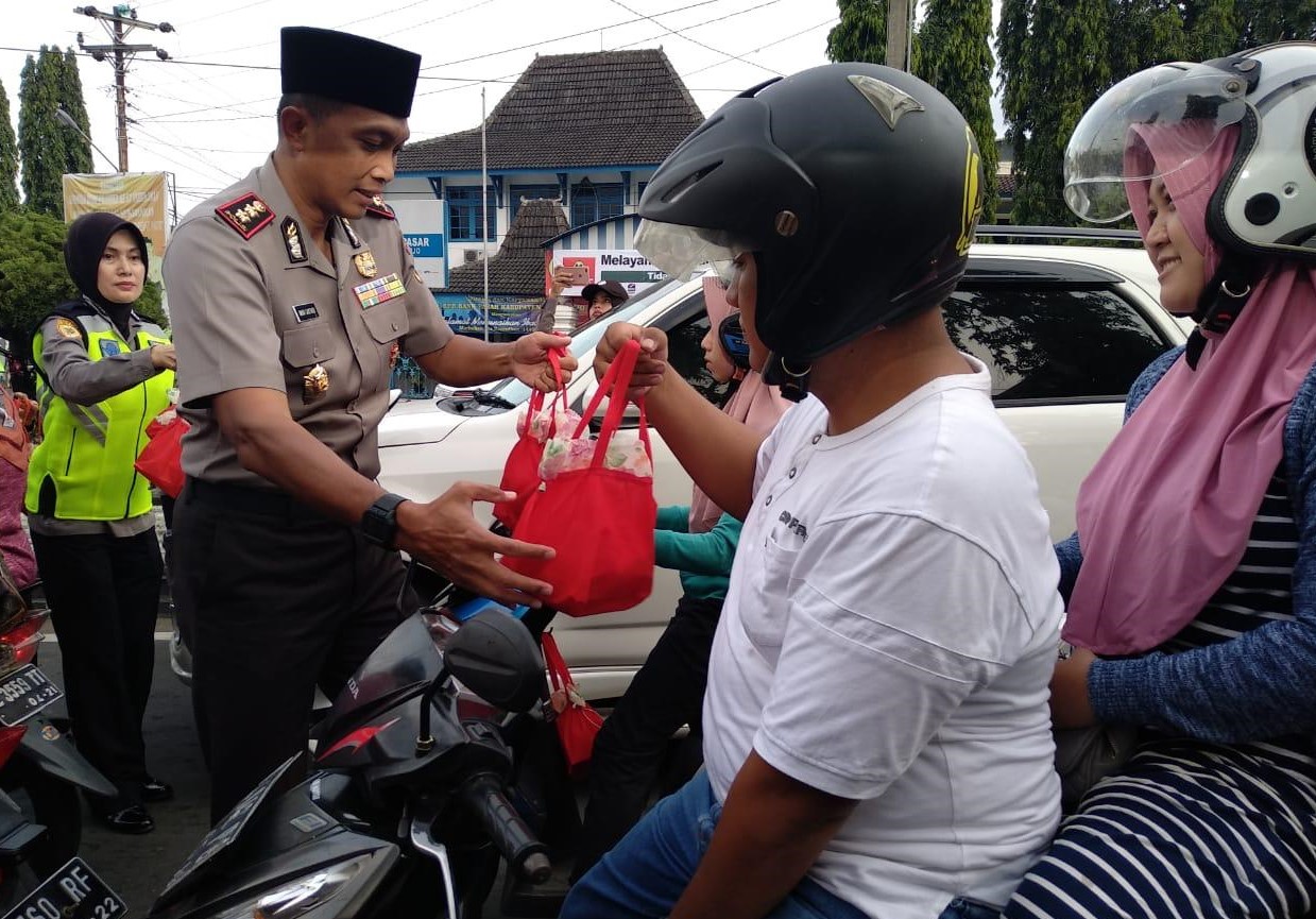 “Takjil yang kami bagikan kurang lebih 500 paket takjil dan dibagikan pada pengendara sepeda motor maupun roda empat yang berhenti ketika lampu merah di simpang lima,” terang Kapolres AKBP Iwan Saktiadi.