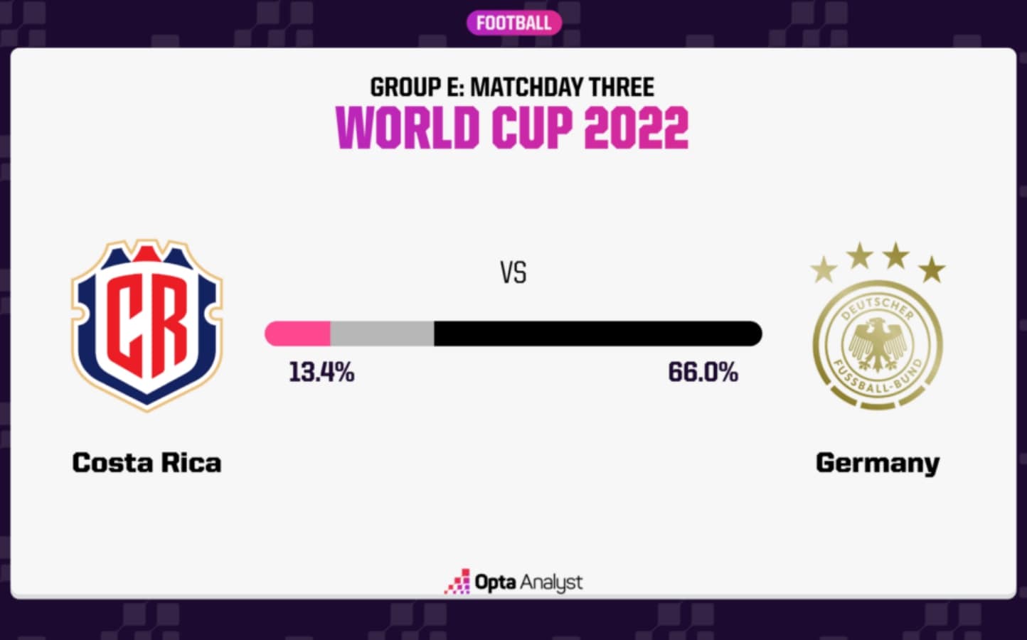 Model Opta memberi Kosta Rika, yang bisa lolos dengan kemenangan, hanya 13,4% peluang untuk kecewa, sementara Jerman adalah favorit besar dengan 66%. (nano)