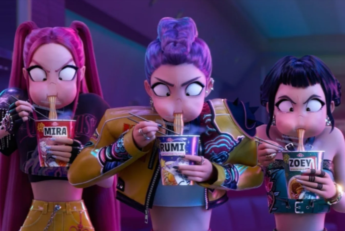 Misalnya, ketika Huntrix pertama kali melihat Saja Boys, para gadis itu berhenti di tempat ketika pupil mereka membengkak menjadi hati merah yang menggembung. Bereaksi terhadap betapa berototnya para pria itu, mata Zoey berubah bentuk beberapa kali lagi, dari perut six-pack menjadi sepasang tongkol jagung mentega. Reaksi wanita muda yang sedang dimabuk cinta ini memberikan alternatif yang tak terlupakan bagi serigala cabul dalam kartun “Red Hot Riding Hood” karya Tex Avery, ketika dua aliran popcorn meletus bagai air mata bahagia dari wajahnya yang merah merona.