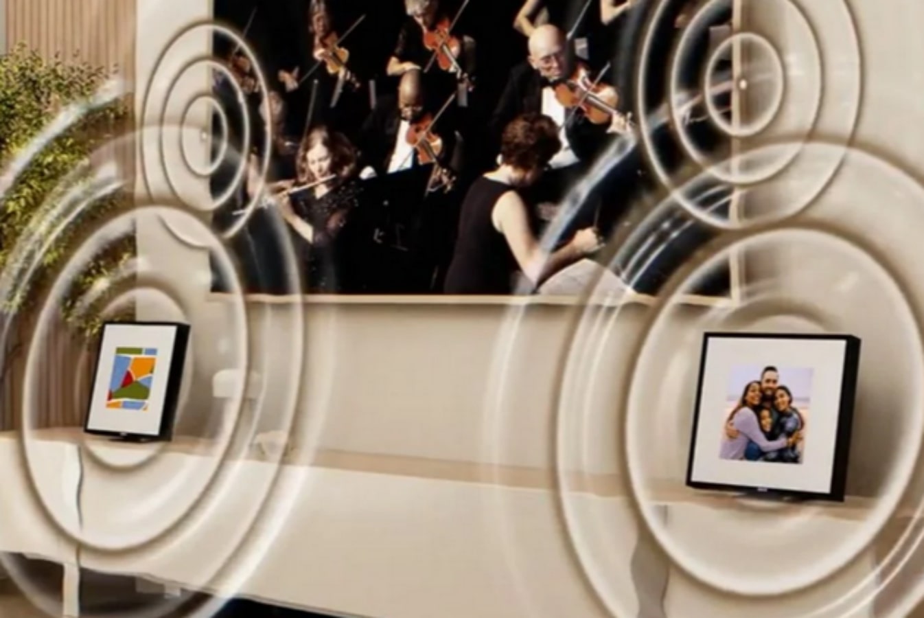 Speaker juga dapat terhubung ke sistem home theater melalui kabel optik Toslink. Asisten pintar seperti Alexa, Airplay, dan Chromecast juga ditampilkan di speaker nirkabel Music Frame.