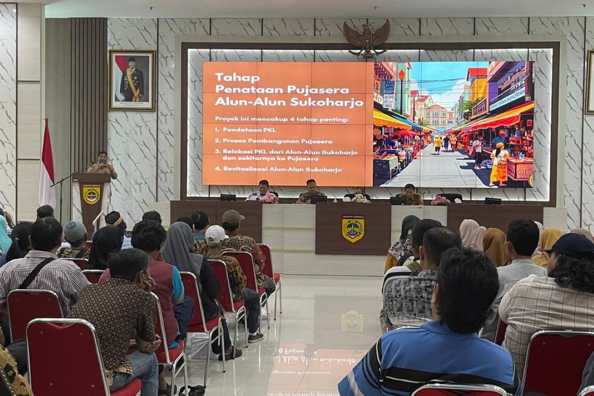 “Proyek ini nantinya mencakup empat tahapan penting, pertama pendataan PKL, proses pembangunan pujasera, relokasi PKL dari alun-alun Sukoharjo dan sekitarnya ke pujasera dan terakhit revitalisasi alun-alun,” terangnya.