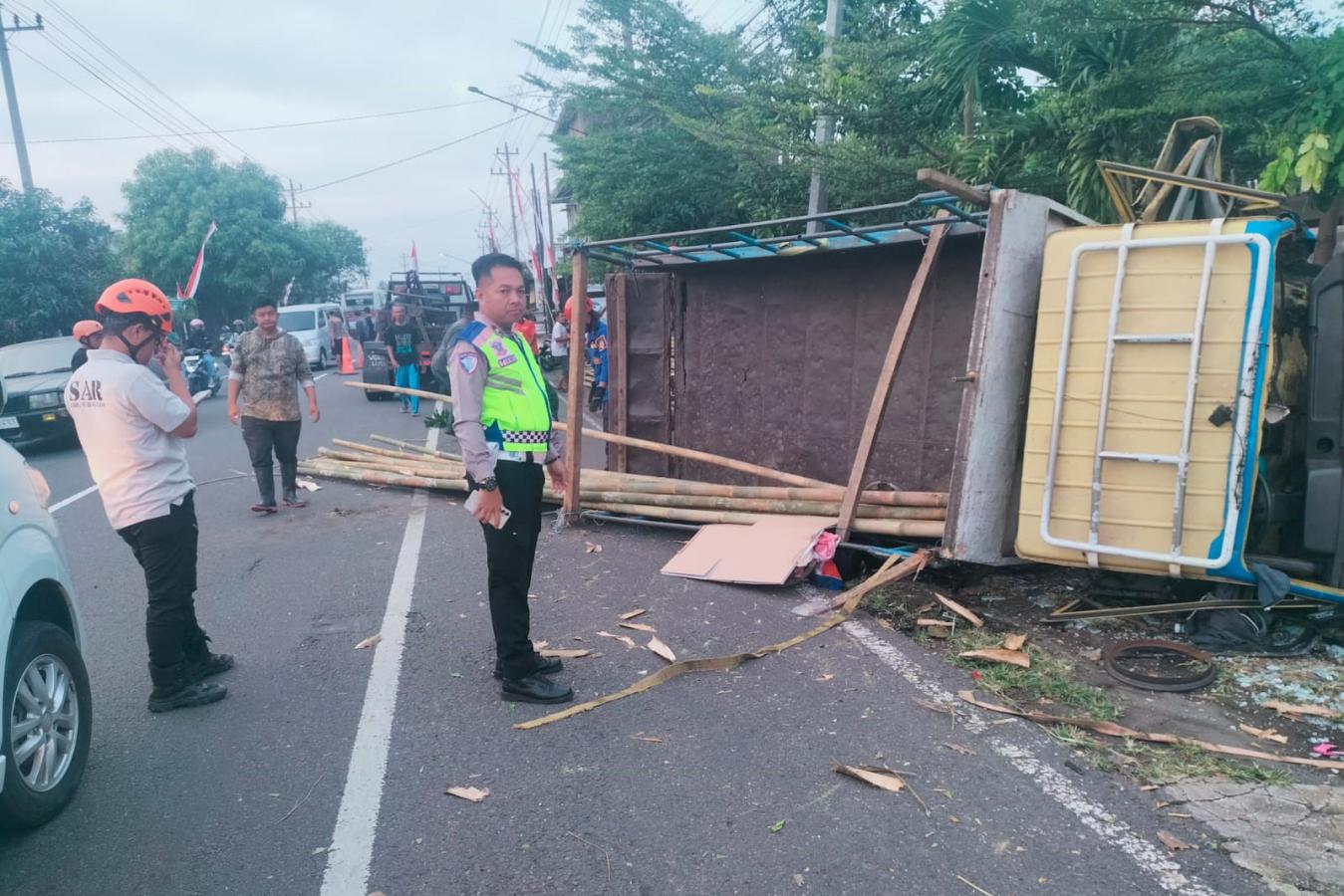 Informasi yang terhimpun menyebutkan, truk yang memuat bambu dengan noomor polisi AE 8141 YF berjalan dari arah selatan ke utara arah Sukoharjo. Setiba di lokasi kejadian, tiba-tiba truk oleng ke kiri setelah itu truk membentur tiang lampu yang ada di pinggir jalan hingga akhirnya terguling ke kanan.