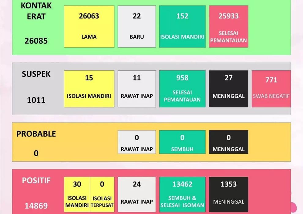 Berdasarkan update Instagram Dinas Kesehatan Kabupaten (DKK), saat ini kasus positif aktif turun menjadi 54 kasus. Terdiri dari 30 orang isolasi mandiri dan 24 orang rawat inap dirumah sakit. Untuk kasus positif meninggal naik dua menjadi 1.353 kasus.