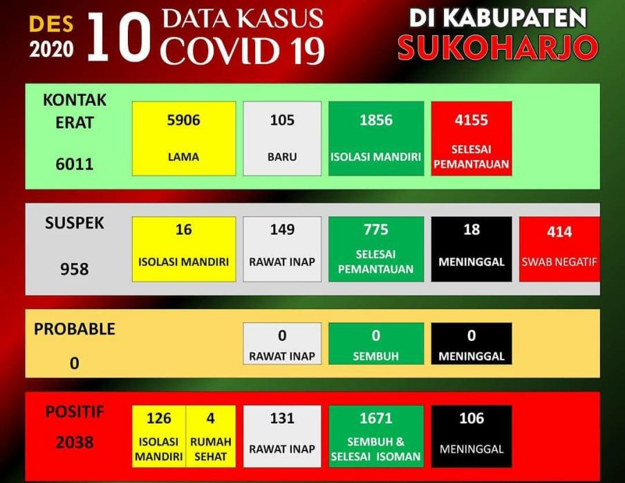 Sukoharjonews.com (Sukoharjo) – Update data kasus Corona di Kabupaten Sukoharjo per 10 Desember hari ini, ada kenaikan 42 kasus positif baru di Sukoharjo. Dengan tambahan 42 kasus baru tersebut, akumulasi kasus positif corona di Sukoharjo saat ini menjadi 2.038 kasus. Disisi lain, kasus positif sembuh naik enam sehingga totalnya menjadi 1.671 kasus dan positif meninggal naik satu menjadi 106 orang.