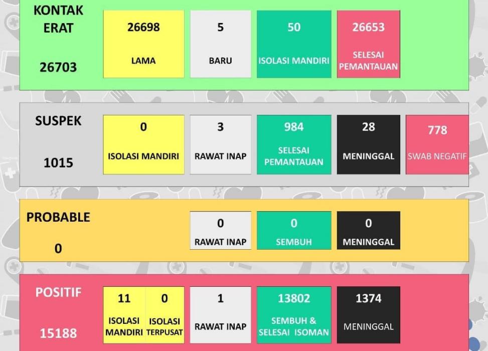 Berdasarkan update Instagram Dinas Kesehatan Kabupaten (DKK), saat ini kasus positif aktif tinggal 12 kasus. Terdiri dari 11 orang isolasi mandiri dan satu orang rawat inap dirumah sakit. Untuk kasus positif meninggal tetap 1.374 kasus.