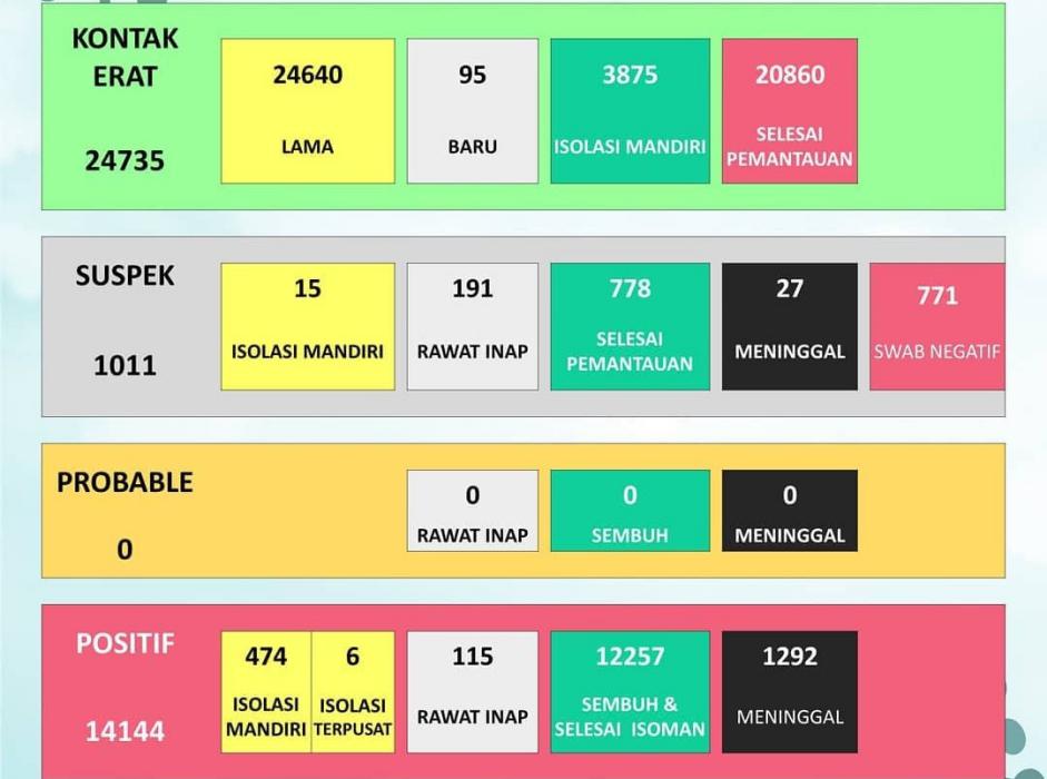 Berdasarkan update Instagram Dinas Kesehatan Kabupaten (DKK), saat ini kasus positif aktif tetap 595 kasus. Terdiri dari 474 orang isolasi mandiri, enam isolasi terpusat dan 115 orang rawat inap dirumah sakit. Untuk kasus positif meninggal naik satu menjadi 1.292 orang. Sedangkan untuk suspek corona masih 1.011 orang yang terdiri dari 15 isolasi mandiri, 191 rawat inap, 778 selesai pemantauan, 27 meninggal, dan 771 swap negatif.
