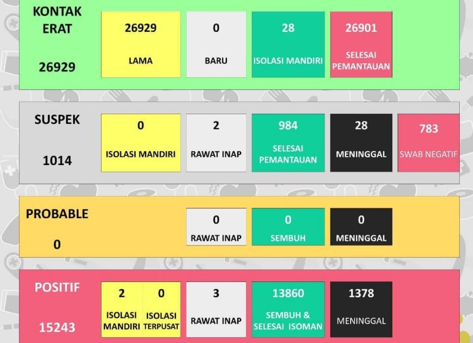Berdasarkan data Dinas Kesehatan Kabupaten (DKK) Kabupaten Sukoharjo, saat ini kasus positif aktif masih lima kasus. Terdiri dari dua orang isolasi mandiri dan tiga orang rawat inap dirumah sakit. Untuk kasus positif meninggal naik satu menjadi 1.378 kasus.