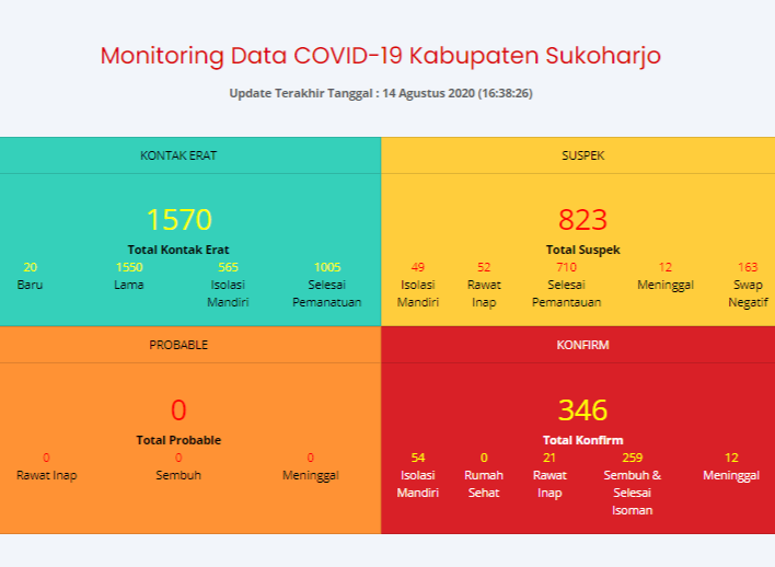 Berdasarkan update di website www.corona.sukoharjokab.go.id, saat ini kasus positif yang masih aktif kembali naik menjadi 75 orang. Terdiri dari 54 orang isolasi mandiri dan 21 orang menjalani rawat inap dirumah sakit. Sedangkan untuk suspek corona ada 823 orang yang terdiri dari 49 isolasi mandiri, 52 rawat inap, 710 selesai pemantauan, 12 meninggal, dan 163 swap negatif.