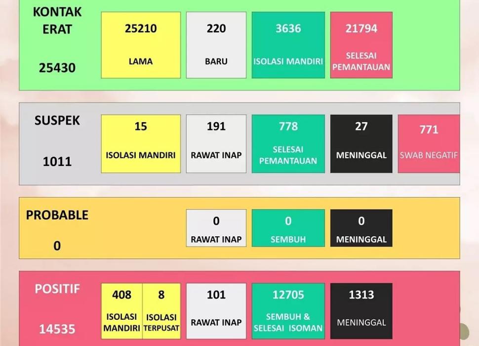 Berdasarkan update Instagram Dinas Kesehatan Kabupaten (DKK), saat ini kasus positif aktif naik jadi 517 kasus. Terdiri dari 408 orang isolasi mandiri, delapan isolasi terpusat dan 101 orang rawat inap dirumah sakit. Untuk kasus positif meninggal naik delapan menjadi 1.313 orang. Sedangkan untuk suspek corona masih 1.011 orang yang terdiri atas 15 isolasi mandiri, 191 rawat inap, 778 selesai pemantauan, 27 meninggal, dan 771 swap negatif.