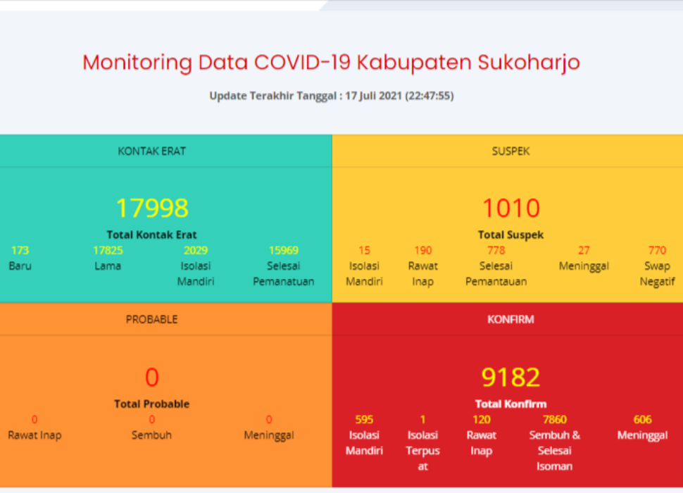 “Berdasarkan update per 17 Juli ini, dalam sehari ada kenaikan 148 kasus positif sehingga akumulasinya menjadi 9.182 kasus. Untuk kasus sembuh naik 193 sehingga totalnya menjadi 7.860 kasus dan untuk positif meninggal naik tiga menjadi 606 orang,” jelas Jubir Gugus Tugas Percepatan Penanganan Corona Sukoharjo, Yunia Wahdiyati, Sabtu (17/7/2021).