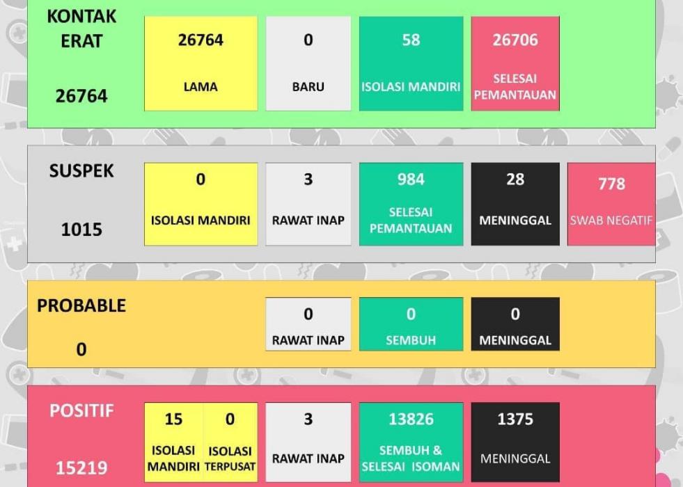 Berdasarkan update Instagram Dinas Kesehatan Kabupaten (DKK), saat ini kasus positif aktif masih 18 kasus. Terdiri dari 15 orang isolasi mandiri dan tiga orang rawat inap dirumah sakit. Untuk kasus positif meninggal naik satu menjadi 1.375 kasus.