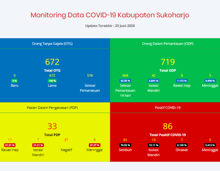 Berdasarkan data di website www.corona.sukoharjokab.go.id, untuk 719 ODP terdiri dari 664 orang selesai masa pemantauan, 42 orang menjalani isolasi mandiri, delapan rawat inap, dan lima ODP meninggal dunia. Untuk 33 PDP, terdiri dari 17 orang rawat inap, tujuh isolasi mandiri, dan sembilan orang meninggal. Tercatat pula 97 PDP dengan hasil akhir, yakni 87 negatif dan 10 orang mendapat diagnosa lain. Ada kenaikan satu PDP yang meninggal dari sebelumnya delapan menjadi sembilan per hari ini.
