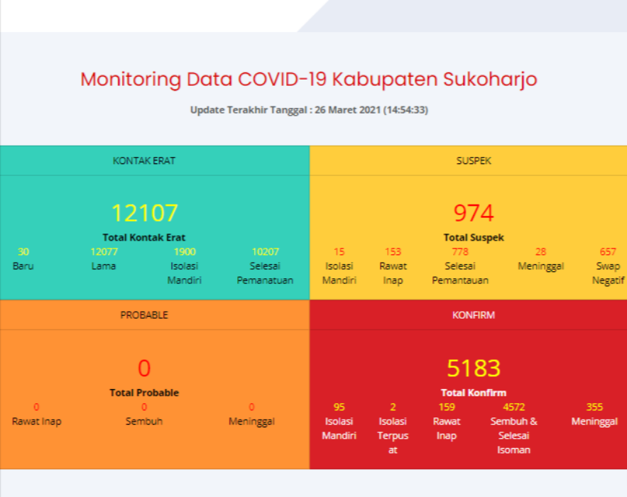 “Berdasarkan update per 26 Maret ini, kembali ada kenaikan 11 kasus positif sehingga akumulasinya menjadi 5.183 kasus. Untuk kasus sembuh naik 14 sehingga totalnya menjadi 4.572 kasus dan untuk positif meninggal naik satu menjadi 355 orang,” jelas Jubir Gugus Tugas Percepatan Penanganan Corona Sukoharjo, Yunia Wahdiyati, Jumat (26/3/2021).