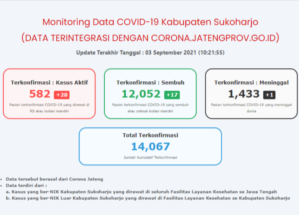 Sukoharjonews.com (Sukoharjo) – Update data kasus Corona di Kabupaten Sukoharjo per 3 September, data kasus corona Sukoharjo mengalami perubahan angka cukup signifikan. Perubahan tersebut terjadi setelah dilakukan integrasi dengan data corona Jateng. Dari update 3 September, akumulasi kasus positif corona menjadi 14.067. Dari jumlah tersebut, 12.052 kasus sembuh, 1.433 kasus meninggal dan 582 kasus aktif. Data tersebut berbeda jauh dengan update per 2 September.