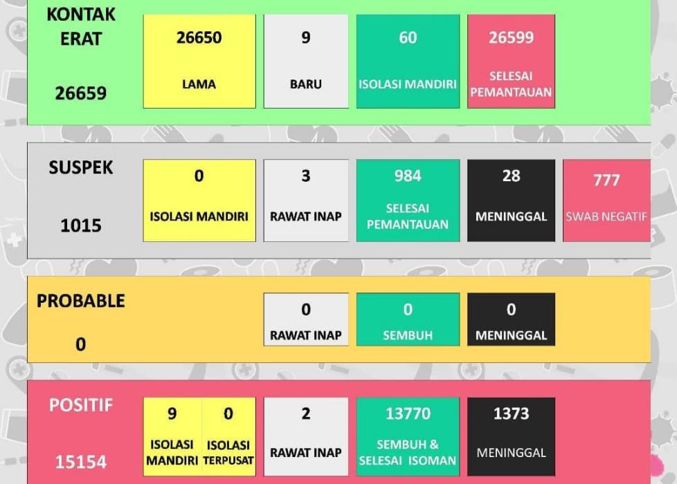 Berdasarkan update Instagram Dinas Kesehatan Kabupaten (DKK), saat ini kasus positif aktif tinggal 11 kasus. Terdiri dari sembilan orang isolasi mandiri dan dua orang rawat inap dirumah sakit. Untuk kasus positif meninggal tetap 1.373 kasus.