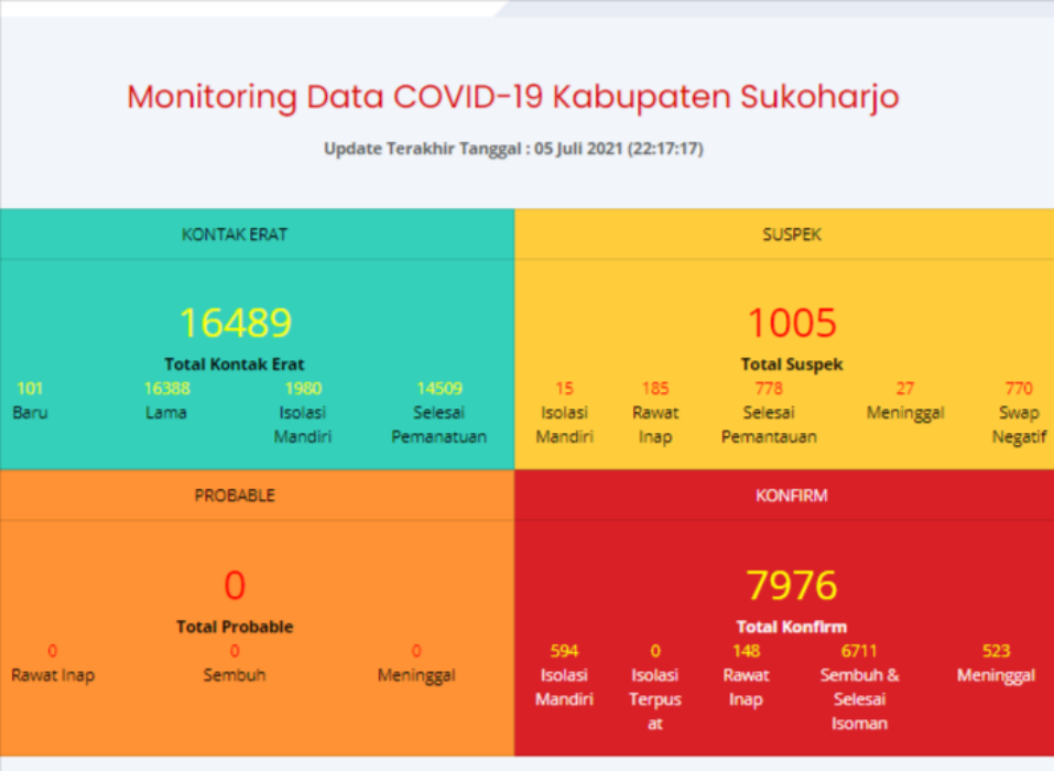 “Berdasarkan update per 5 Juli ini, dalam dua hari ada kenaikan 100 kasus positif sehingga akumulasinya menjadi 7.976 kasus. Untuk kasus sembuh naik 58 sehingga totalnya menjadi 6.711 kasus dan untuk positif meninggal naik tujuh menjadi 523 orang,” jelas Jubir Gugus Tugas Percepatan Penanganan Corona Sukoharjo, Yunia Wahdiyati, Senin (5/7/2021).