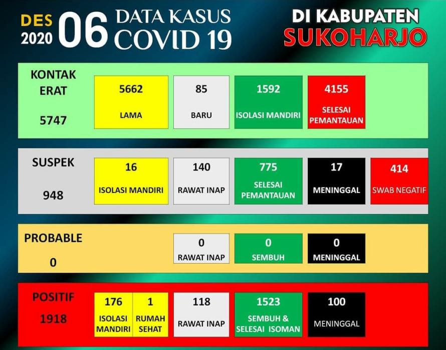 Berdasarkan update www.corona.sukoharjokab.go.id, saat ini kasus positif aktif tinggal 295 kasus. Terdiri dari 176 orang isolasi mandiri, satu isolasi rumah sehat, dan 118 orang menjalani rawat inap dirumah sakit. Untuk kasus positif meninggal naik tiga dari 97 menjadi 100 orang. Sedangkan untuk suspek corona ada 948 orang yang terdiri dari 16 isolasi mandiri, 140 rawat inap, 775 selesai pemantauan, 17 meninggal, dan 414 swap negatif.