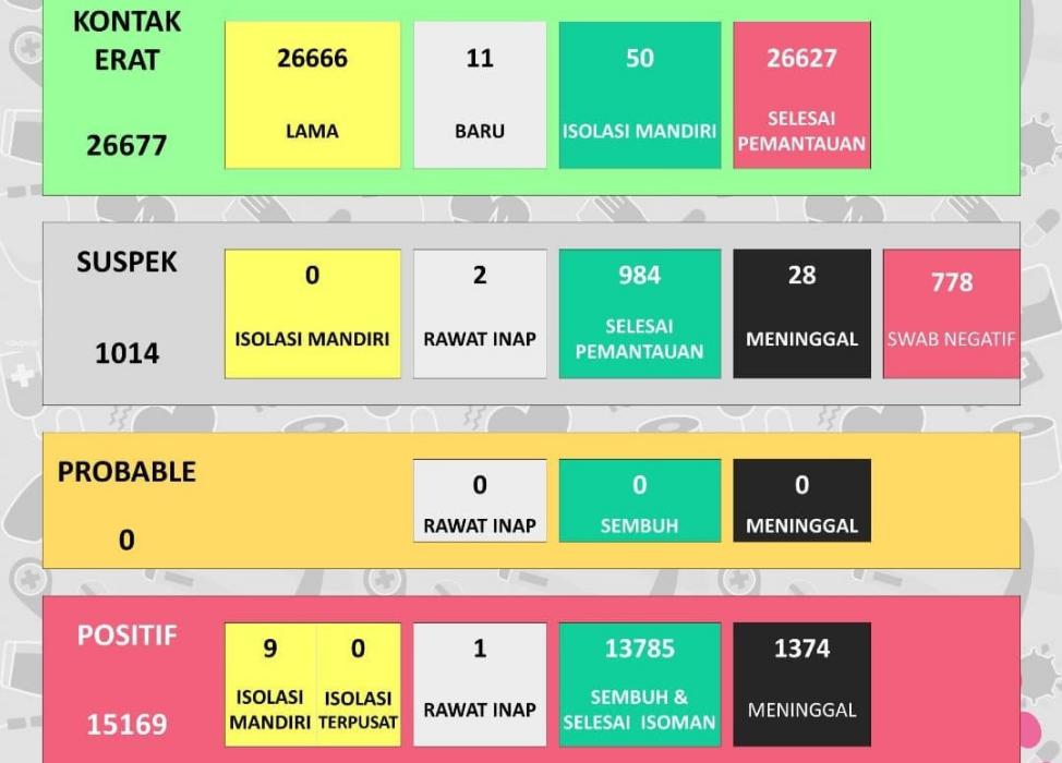 Berdasarkan update Instagram Dinas Kesehatan Kabupaten (DKK), saat ini kasus positif aktif tinggal 10 kasus. Terdiri dari sembilan orang isolasi mandiri dan satu orang rawat inap dirumah sakit. Untuk kasus positif meninggal tetap 1.374 kasus.