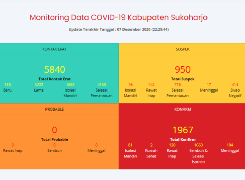 Sukoharjonews.com (Sukoharjo) – Update data kasus Corona di Kabupaten Sukoharjo per 7 Desember hari ini, ada kenaikan 49 kasus positif baru di Sukoharjo. Dengan tambaham 49 kasus baru tersebut, akumulasi kasus positif corona di Sukoharjo saat ini menjadi 1.967 kasus. Disisi lain, kasus positif sembuh naik signifikan 137 kasus sehingga totalnya menjadi 1.660 kasus dan positif meninggal naik empat menjadi 104 orang.