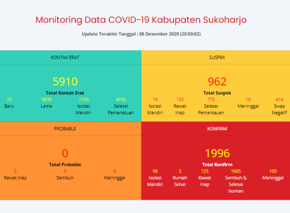 Sukoharjonews.com (Sukoharjo) – Update data kasus Corona di Kabupaten Sukoharjo per 8 Desember hari ini, ada kenaikan 29 kasus positif baru di Sukoharjo. Dengan tambaham 29 kasus baru tersebut, akumulasi kasus positif corona di Sukoharjo saat ini menjadi 1.996 kasus. Disisi lain, kasus positif sembuh naik signifikan lima kasus sehingga totalnya menjadi 1.665 kasus dan positif meninggal naik satu menjadi 105 orang.