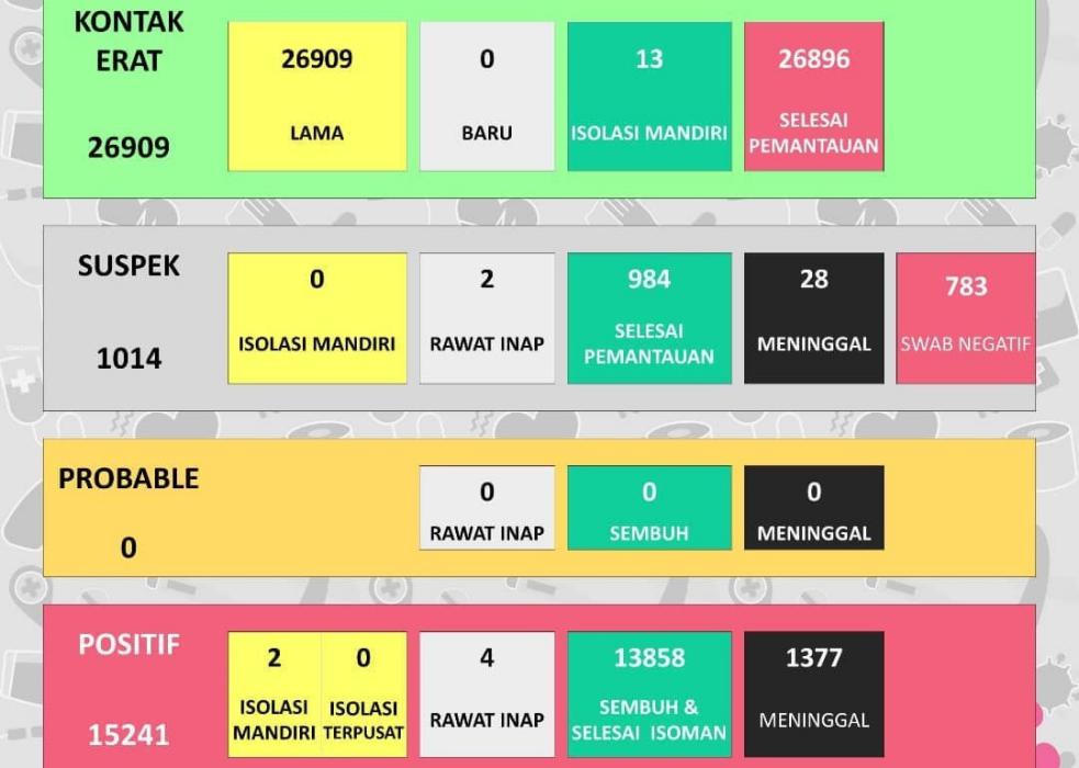 Berdasarkan data Dinas Kesehatan Kabupaten (DKK) Kabupaten Sukoharjo, saat ini kasus positif aktif masih enam kasus. Terdiri dari dua orang isolasi mandiri dan empat orang rawat inap dirumah sakit. Untuk kasus positif meninggal tetap 1.377 kasus.